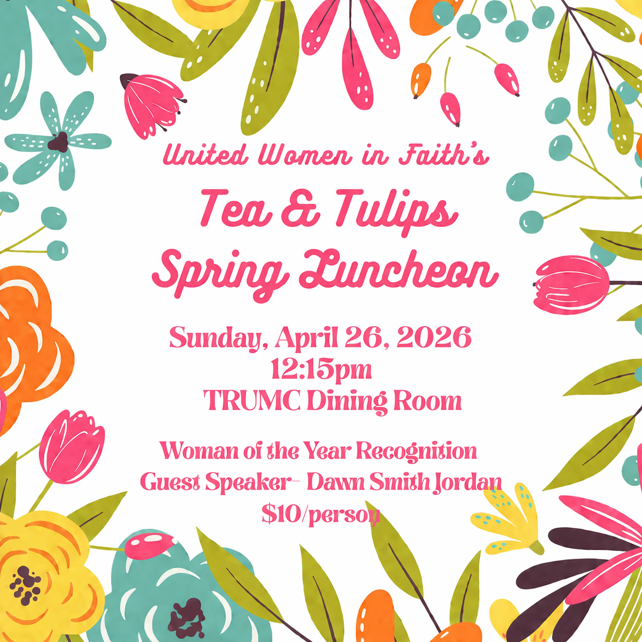 All ladies of the church are invited to the Tea & Tulips Spring Luncheon hosted by United Women in Faith. Guest speaker: Dawn Smith Jordan. Cost: $10 per person. RSVP payments (cash or check) will be collected in the West Foyer on Sundays.