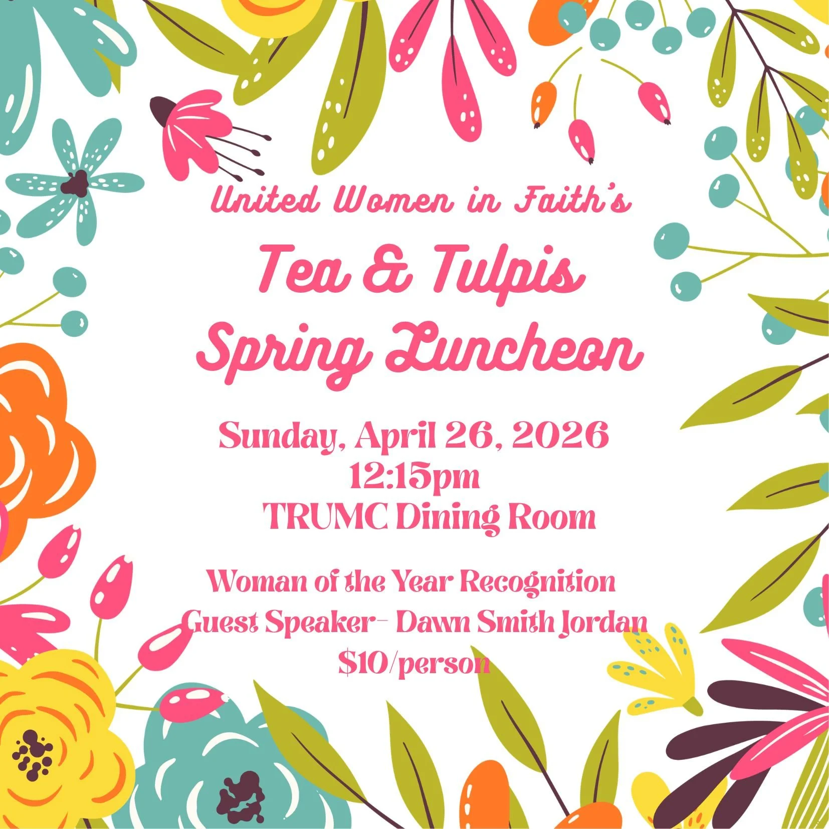 All ladies of the church are invited to the Tea & Tulips Spring Luncheon hosted by United Women in Faith. Guest speaker: Dawn Smith Jordan. Cost: $10 per person.