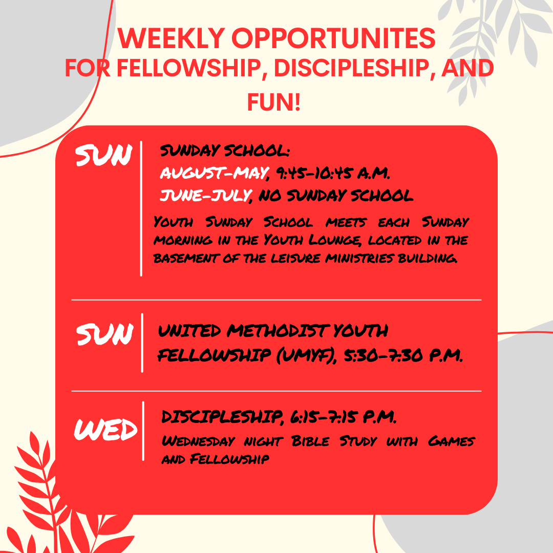 Our weekly gatherings include United Methodist Youth Fellowship, Discipleship (Bible Study), and Sunday School. We believe in nurturing a sense of community, where lifelong friendships are formed, and support systems are established.